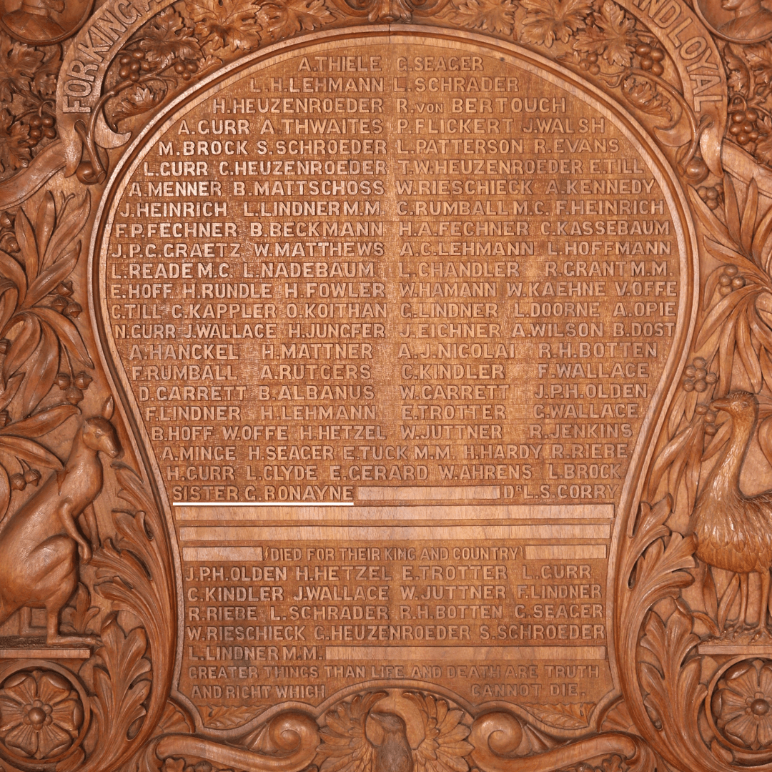 Across a number of following years her mother Phoebe, sister Valerie and brother Marcus followed her lead, also changing their surnames. Lilian’s remaining brother Roland, well known across the Barossa as ‘Rollie’, retained the Von Bertouch surname and also served in WW1. The dark timber honour roll in Tanunda Soldiers Memorial Hall that proudly declares “for King and Country”, with its cameos of King and Queen side by side with an Emu, Kangaroo and piping shrike, includes the names of both Lilian and Roland.